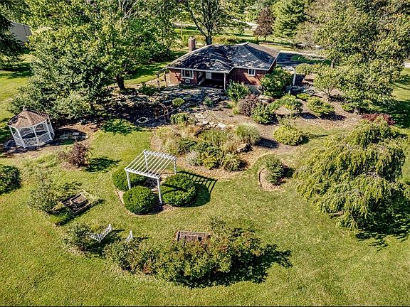 A serene location in Washington Twp on a 1.5 acre lot. The back porch allows you to take in the breathless landscaping and country views which includes an arbor, seasonal blueberry, a pond with flowing water stream and a walkover bridge, natural stone patio and walkway, Amish made gazebo, shed with electric, and all over gorgeous landscaping. Inside this spacious brick home you will find a wood burning fireplace and a huge bay window in the living room, a dining room, a kitchen with custom built in desk and two large windows viewing the back yard and letting lots of natural sunlight in, 3 large bedrooms, ample closets, and 1.5 baths. This home features gleaming oak hardwood floors, a huge basement with a spacious game room for entertaining, and a second half bath ready to be finished into a full bath. Plenty of parking spaces for an additional 5 vehicles in the large driveway. This charming home awaits you to relax and enjoy country living but conveniently close to town!