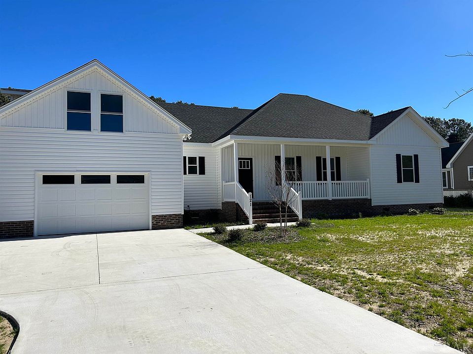 **New Construction in Grandy! Close to VA and the OBX.** This is a must see home! With modern farm house flare, this home is situated on almost a half acre in the Carolina Club. With contemporary fixtures and selections, this home is move in ready. The shiplap further enhances the farm house look. The living & kitchen space has a bright & open feel that is accentuated by the large slider in den and and kitchen window. With stainless appliances and bright white cabinetry, the clean lines are even more apparent. The lower level primary bedroom features a large walk in closet with plenty of space for storage. The adjoining bathroom is a show stopper with separate soaking tub and double sink vanity with modern fixtures. The other three spacious bedrooms all feature ample closets and lots of light. The laundry room is the perfect size and features a utility sink along with plenty of cabinet space for storage.