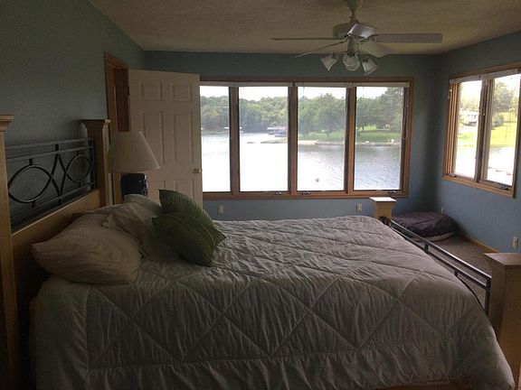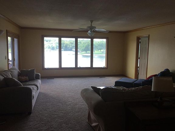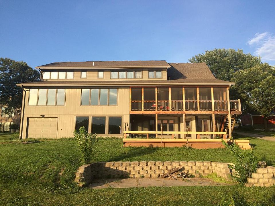 Spacious 5500 sq. ft. finished waterfront home on the lake. Beautiful views of the lake from the home, complete with concrete boat dock, patio by the water, screened lani& covered patio lakeside. Master suite + 4 bdrms, 3.5 baths, lg open kitchen w/ stainless appliances, formal dining, kitchenette on lower level. living rm on main level, family rm. on lower w/ pool table and game rm area. 2 car garage on main, boat garage and/or workshop on lower lake side, Permanent decking, concrete drive, great cove area w/ good water in very nice neighborhood area of the lake.