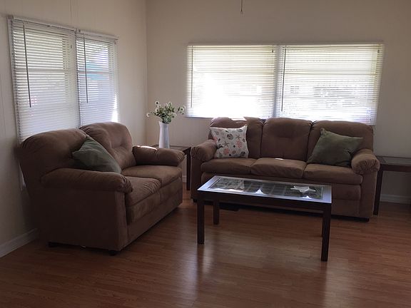 Are you looking for a 55+ community with a home priced to sell? This is the home you're looking for and the one with all of its charm. Imagine waking up to a warm sunrise, enjoying your coffee in your oversized screened in porch, surrounded by beautiful trees all around, giving you shade and breeze. NEWER double impact windows allow that beautiful Florida sun to naturally lighten and welcome the day. Kitchen comes fully stocked with appliances including fridge, oven/range and microwave. Additional appliances include washer & dryer set. The kitchen also boasts lots of adorable windows allowing full of lots natural lighting, giving home a bright and cheery feel. The spacious floor plan has NEW laminate flooring in every room, giving home a modern style. Other features include NEWER central A/C, NEW vapor barriers, ceiling fans and built-in cabinets. Master and guest bedrooms have lots of space, with plenty of windows to brighten your day at any time of day. This home is also located on a Cul-de sac and has multiple covered sitting areas, including the screened in covered porch area for those whole love the Florida warmth. With plenty of parking, hurricane shutters and a shed to give you extra storage space what else do you need. Don`t miss out on this affordable opportunity!