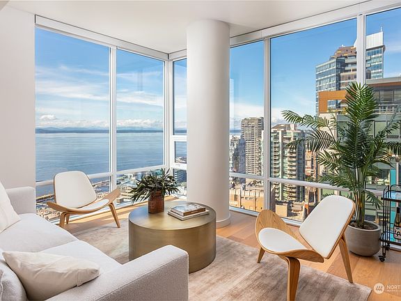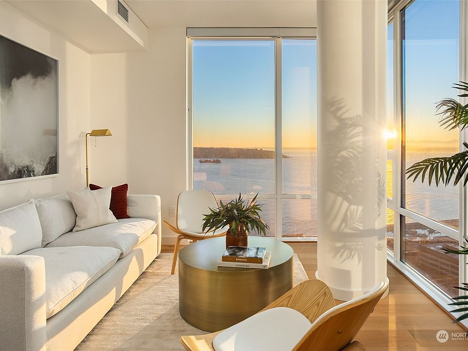 Experience the best view The Emerald has to offer! Unlimited access to sunsets and unrestricted views of Pike Place Market, Olympic Mountain Region, and the Puget Sound. The most popular and desirable sold-out floorplan in the building, back on the market as a limited offering. This generously appointed two-bedroom features Bosch appliances, custom closets, motorized rolling shades, gas cooktop, and custom wood cabinetry with oak floors. One parking spot included. The Emerald offers a collection of impressive amenities: Entertain/dine/lounge/work high above it all in the Olympic Room, the most stunning vista in Seattle. 24/7 concierge professionally managed by CWD. Fitness center, guest suite, Tesla carshare, pet terrace.