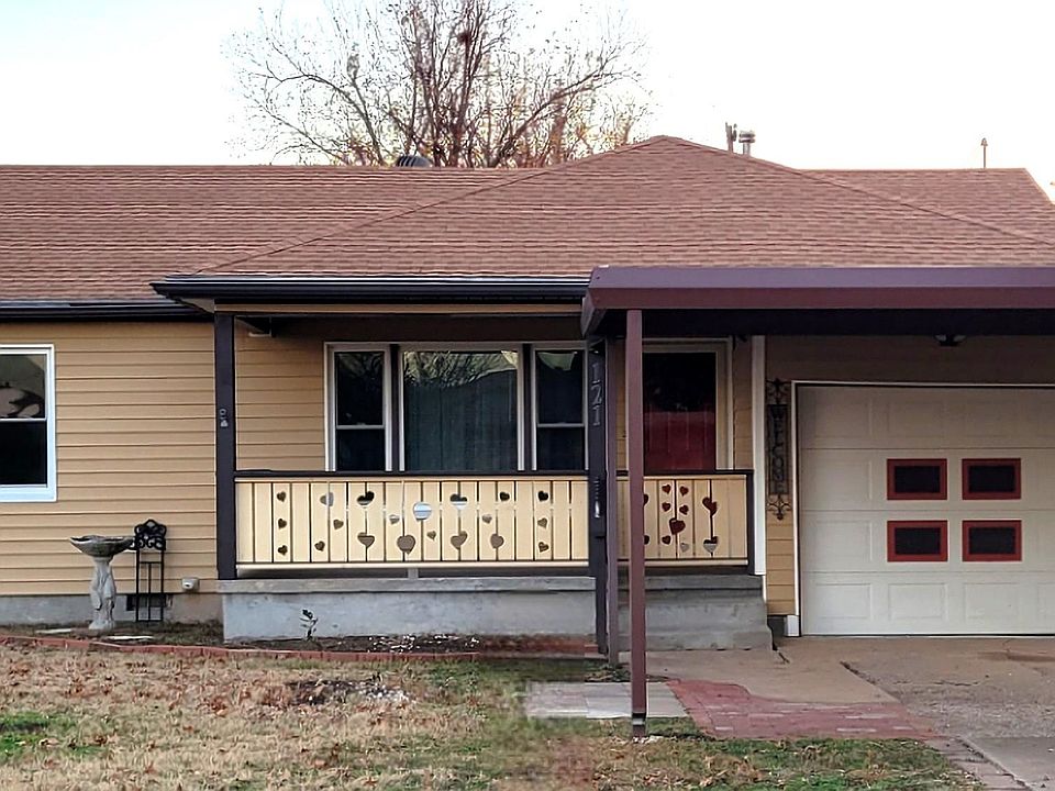 Check out this nice and neat, very clean 3 bedroom and 2 bath with a storm shelter basement room. This home has only had 2 owners that took much pride in their ownership and it shows throughout. Many upgrades to the property make it just perfect for this price range. Beautiful original hardwood floors throughout most of the home. Brand new carpet where hardwood does not exist. Newer siding, roof, windows, and guttering. The third bedroom has a gas fireplace and is large enough that it could be split into a family room as well. The home has lots of storage! Appliances stay with the property. The front porch has a retractable shape for privacy or shade. The basement room which is a ventilated storm shelter is painted bright white and well-lighted. Covered 16 x 32 patio with added pavers to extend out making it great for entertaining. Has a 6x8 and an 8 x 14 storage shed. The backyard is fully privacy fenced in. Off of the utility room is a 12 x 20-side patio. A 2-car carport sits in front of the 1-car attached garage. Priced to sell quickly! This property sits close to high school, swimming pool, football field, and teen center.