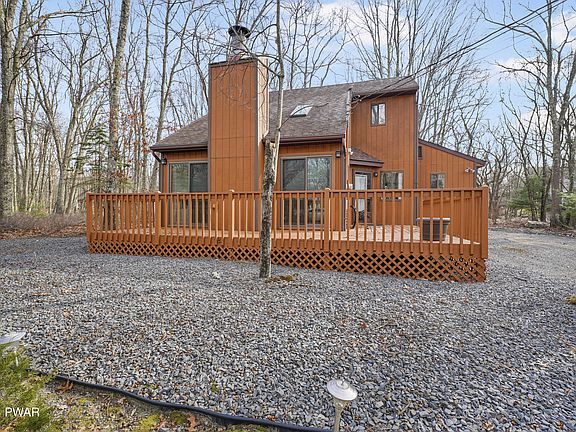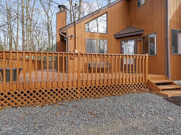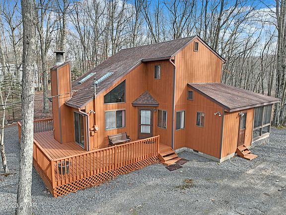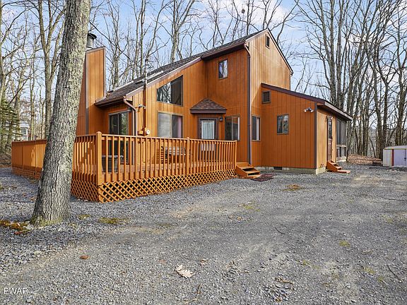 TURN-KEY & IMMACULATE 3 BED, 2 BATH HOME IN AN AMENITY FILLED GATED COMMUNITY! SITUATED ON 1.16 ACRES AND BACKING UP TO A GREENBELT SPACE! Seller will consider selling this home fully furnished! Just 90 minutes to NYC, search no further for your private retreat to the beautiful Poconos. Cozy up to your brick-faced, wood burning fireplace in your two-story great room OR watch the magnificent leaves changing color it the Fall in your 3 season room; the perfect space for taking in all things nature! First floor bedroom & full bathroom for those looking to avoid stairs! First floor laundry as well! Upstairs two spacious bedrooms set up to sleep plenty of friends & family! Flip switch turns of water & drains pipes easing any stress when you are not there! 1 YEAR HOME WARRANTY INCLUDED, Beds Description: Primary1st, Baths: 1 Bath Level 1, Baths: 1 Bath Level 2, Eating Area: Dining Area, Beds Description: 2+BED 2nd
