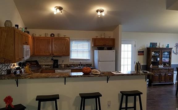 Ranch home, Move in Condition, Kitchen with lots of cabinets, and Bar area, dining area, family room, large master bedroom with full bath, Kitchen appliances stay, Home has a water treatment system. The shed in back yard stays