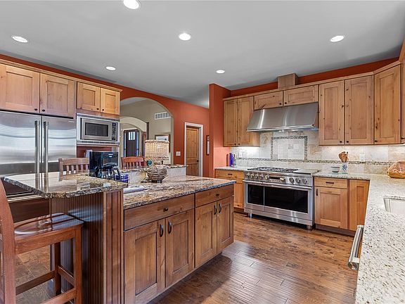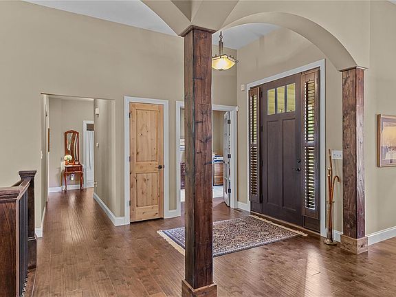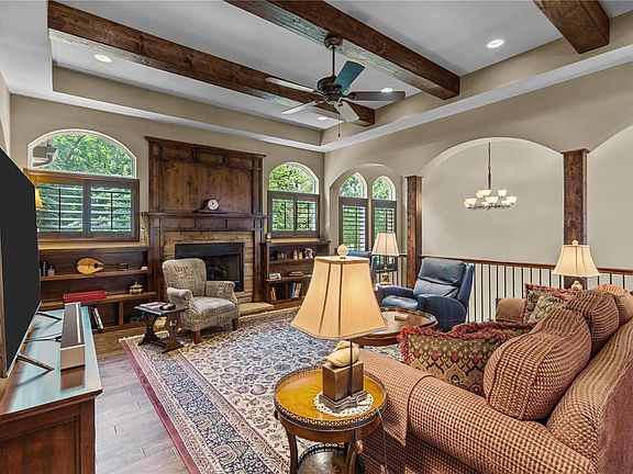 Like-new ranch home backing to woods. New Birch hardwood floors (2022 - $7k). New plantation shutters (2017 - $17k). 11-foot ceilings. Great room w/ gas fireplace, wall of windows, built-ins, & rustic ceiling beams. Gourmet kitchen w/ 42” cabinetry, new GE Monogram appliances (2023 - $17k), granite countertops, under-counter lighting, center island breakfast bar, & walk-in pantry. Luxury master suite w/ coffered ceiling, custom walk-in closet, dual vanities, & water closet. Main level laundry room w/ new cabinetry (2018 - $3k). Finished walk-out lower level w/ deep 9-foot pour & granite shaker-panel wet bar. Drywalled 3-car garage w/ workbench & ample outlets. New French doors (2022 - $7k). New Kohler toilet (2023 - $400). Knotty Alder doors & cabinetry. Premium stone elevation w/ new siding & trim (2022 - $6k). Gutter guards. Park-like yard w/ two patios. landscaping, buried downspouts, smart Rainbird irrigation system, & stone entry piers w/ coach lights. Composite deck w/ gas line.