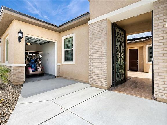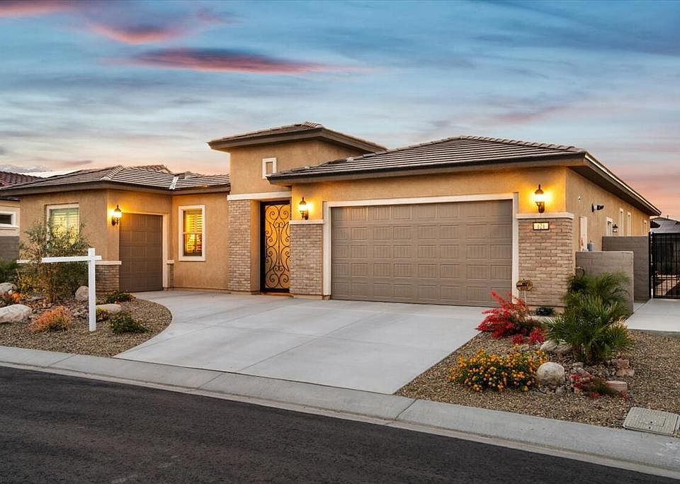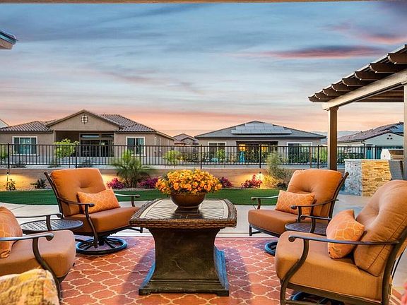 Introducing this Prairie JOURNEY featuring 2 BED, 2.5 bath w/ EXPANDED OWNER'S SUITE plus OFFICE; 2 car plus golf cart storage w/est. 2560 SqFt. The large premium lot enjoys beautiful mountain views. Inside, Level 3 cabinetry in Sumner Maple-Chocolate, EXECUTIVE ISLAND, Yukon Blanco Quartz Counters, Culinary and Lux Kitchen Package: Kitchen Aid appliances w/ BUILT IN REFRIGERATION, 42'' uppers & custom backsplash plus BUTLER PANTRY. Sophisticated 12x24 porcelain tile throughout & upgraded carpet in bedrooms. Gathering Room features the MULTI PANEL SLIDING DOOR system, 60'' fireplace w/custom built-ins and motorized custom window coverings plus 7 channel SURROUND SOUND! The tranquil expanded Owner's Suite features a sliding door, ensuite with LOW-THRESHOLD GLASS RAIN SHOWER w/custom surround. Laundry 2 w/sink & upper cabinets; custom surround in Guest Suite Bath. Technology plus w/ Smart Home Pkg with smart Garage Door Opener, Door Lock and VOICE CONTROL. Built in barbecue area with custom Pergola on the rear patio. LEASED SOLAR ($205/mo), Spartaflex coating in main garage w/custom storage and custom landscape...this home has it ALL! Schedule a showing today & experience all the best life has to offer - at Del Webb Rancho Mirage.
