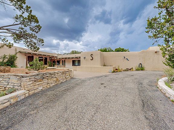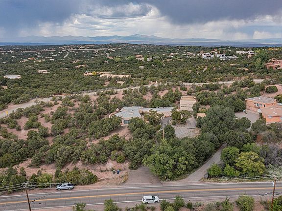 Charming 1960's adobe/block/frame home on prestigious Bishops Lodge Rd! Large 1.67 +/- ac lot sits high on the ridge just a short distance north of downtown Santa Fe and just across from Brownell-Howland Rd and just below Circle Dr (two of the nicest street addresses in SF!) The house has enjoyed numerous upgrades over the years but is now ready for someone with the vision to transform this property into something truly excellent. The lot is covered with fantastic old-growth Pinon Trees and has nice Sun and Moon Mountain views. With the right additions, there is potential to capture even more mountain views. This property is perfect for an auto collector or someone who needs a ton of extra storage space. There is an attached oversized attached 2 car garage, a detached oversized two-car garage, and a magnificent 1,200 sq. ft. fully finished and heated garage/workshop/studio with 220 amp service, epoxy floors, alarm system, cable tv, and phone. This space could also be used as high-end RV or Boat storage and with water and sewer very close by one could quite easily convert it into a guest house.