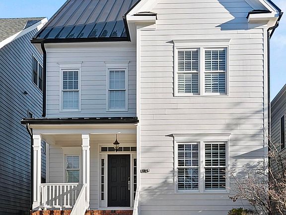 Gorgeous Custom Village Square home featuring 4 beds, 3.5 baths! Enjoy low-maintenance living with open spaces including large kitchen island w/bar, naturally lit family room w/gas fireplace. Kitchen boasts quartz countertops, upgraded cabinets and appliances 2020. 1st floor features dining room, breakfast room and mudroom. Nest thermostats and wifi enabled lighting. Fresh exterior paint 2023. Enjoy the front porch as well as covered porch and private patio in back yard. South facing home. Stunning metal roof replaced 2022. Brazilian Walnut (Ipe) decking and fence. Community has resort-like amenities including neighborhood dog park, pools, fitness center, playground that are walkable! Close to 540/RTP, shopping, dining, & more!