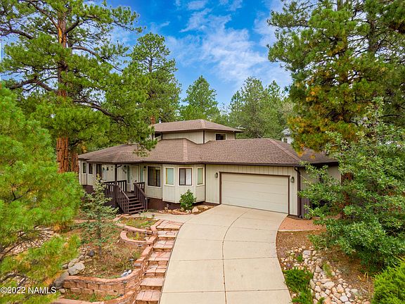 Cul-De -Sac location. Close to the base of MT Elden for the Urban Trail access to Buffalo Park. The entry way is stunning with curved staircase and Saltillo tile. Living room has south facing windows for extra warmth in winter months, vaulted ceilings and wood burning stove. Home Office / bonus room with built in window seat. The kitchen has hard wood floors, granite counters and breakfast nook.. Primary bedroom is on the main level with vaulted ceilings with large primary en-suite with dual sinks, jetted tub, 2 walk in closets and walk in shower. The secondary bedrooms are large and located upstairs.. Additional features are South facing driveway ,NEW Furnace/ AC, unit and large crawl space for extra storage. 10 minutes away from Flagstaff Medical Center.