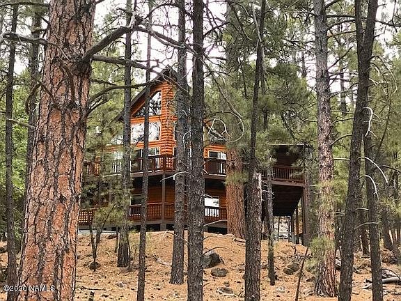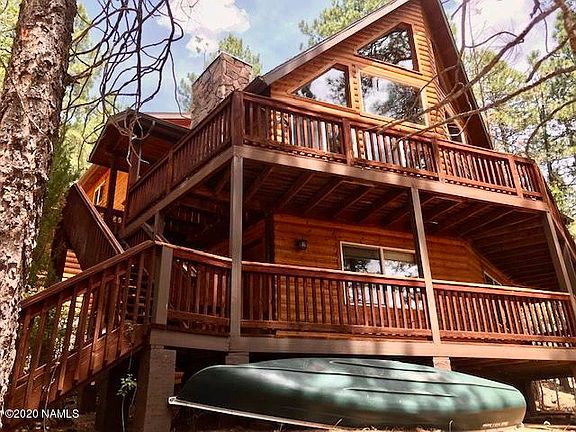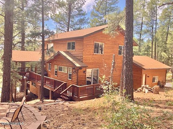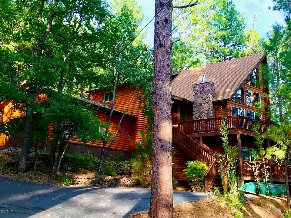 FIRST TIME EVER ON THE MARKET! Beautiful original owner home on 3/4 acre in Munds Park, AZ. Privacy on all sides! 3 large bedrooms , 3.5 bath, loft, gameroom! Home sits halfway up the lot, providing spectacular ponderosa pines views. The current owners call it their ''treehouse'' and once you see the views, you'll know why! It is half log sided and was recently sanded to bare wood and re-stained late last summer (2019). Deck and outdoor fire pit are wonderful areas to enjoy the beautiful weather and the serenity. Outdoor wrap-around decks on upper and lower levels (redwood, that was re-stained last summer) Walk out basement that goes out to additional guest parking . Additional parking for 2 vehicles or toys outside next to attached 2-car garage. Home is wired w/4 sets of speakers,