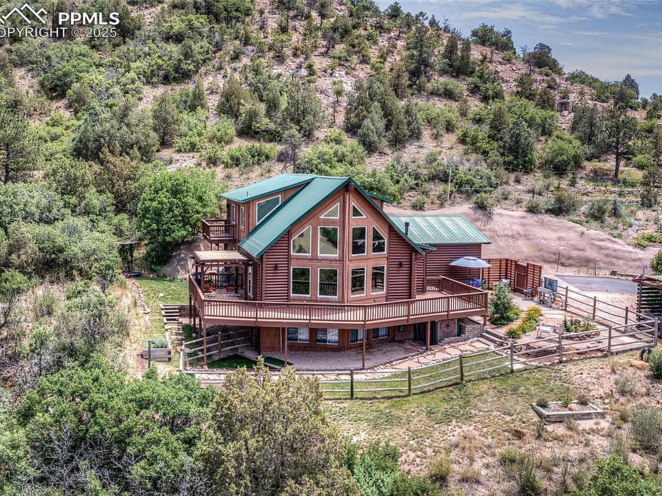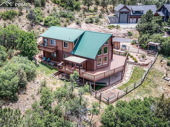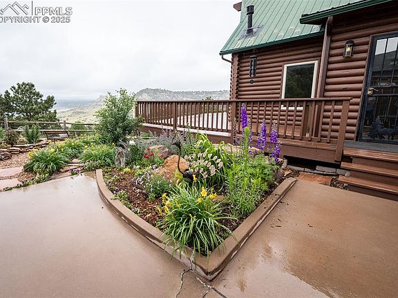 One owner custom log 1½ story home with 4 bedrooms, 3 baths & 3360 sq ft on 1.45 acre hillside lot backing to open space & siding on 35 acre restricted land that can’t be built on. Unobstructed breath-taking mountain, Pikes Peak & Pulpit Rock views ~ privacy & rustic charm~ 2 primary suites (main & upper levels, both w/ walk-in closets, private baths & walk outs- Remodeled slab granite & stainless-steel island kitchen totally open to the great room, living & dining room w/ 2 stories of west facing glass & sliding glass doors opening to an 80x10 partially covered deck. Remodeled baths ~ Open loft area overlooking the living area ~ Garden level basement finished in 2016 & hardly ever used. Room to park an RV ~ Flat fenced yard for dogs or kiddos ~ Walkways lawn area & pergola ~ Metal roof ~ Post and beam construction ~ Soaring knotty aspen wood vaulted ceiling ~ solid wood 6 panel doors ~ Finished & painted attached 2 car garage. IF YOU ARE LOOKING FOR PRIVACY, BREATHTAKING VIEWS & THE FEELING OF MOUNTAIN LIVING IN THE CITY, ALL WITHIN LESS THAN 5 MINUTES TO NEVADA AVE & THE GREAT SHOPPING & DINING IN UNIVERSITY VILLAGE THEN THIS IS THE ONE FOR YOU!
