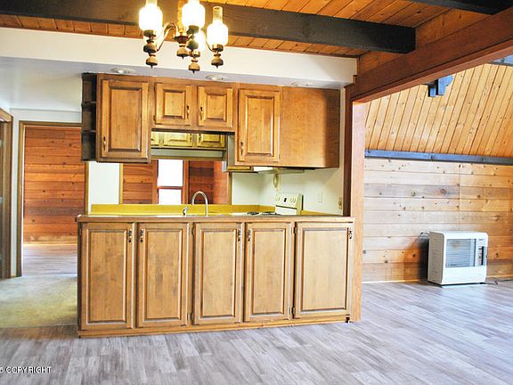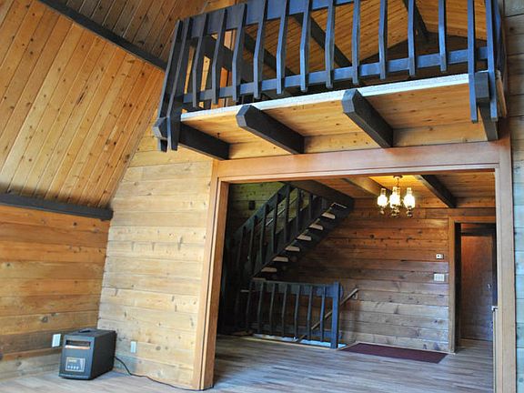 The location is great for this chalet-style house: close to school and town, but set back from the road for privacy. The three-bedroom, two bath house is built over an unfinished basement space. The living space is designed with the kitchen in the center and living areas off it. Vaulted ceilings lend a spacious feel and sliding glass doors and large windows allow light to