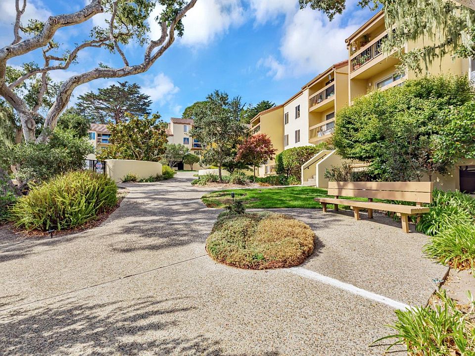 This immaculate, attention to detail updated light-filled 2-bedroom, 2-bathroom second-story unit offers serene treetop and central courtyard views, facing the inviting heated pool. Step onto your private balcony and into a beautifully updated space featuring a fully remodeled open kitchen with custom white Thomasville cabinetry, Kohler fixtures, Carrara countertops, white Venetian glass tile backsplash, and brand-new stainless steel appliances. The living room showcases newly installed natural oakwood flooring with eco-cork underlayment for sound reduction, complemented by refinished hardwood floors throughout and new baseboards in the living and dining areas. Both bedrooms feature brand-new, natural wool Berber carpeting from New Zealand, offering comfort and sustainability. The master suite includes a walk-in closet and an updated ensuite bathroom with dual sinks. Every room, including closets, has been professionally painted in a warm neutral with crisp Swiss Coffee trim and crown molding for a timeless finish. Enjoy the easy lifestyle with access to beautifully landscaped common areas, a heated pool, BBQ area, clubhouse, laundry facility, and a private parking garage. Just minutes from vibrant downtown, Fisherman's Wharf, and scenic coastal walking and biking trails.