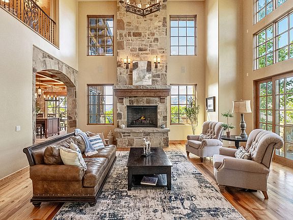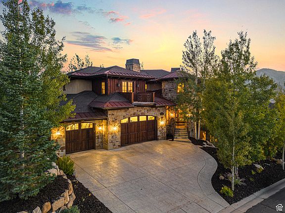 Perched above the Jordanelle Reservoir with sweeping views of Deer Valley Resort, the future Mayflower Mountain Resort, and Mt. Timpanogos, this Tuscan-inspired villa offers timeless architecture and a setting designed for gathering. Backing to open space in Hideout Canyon, the home blends European character with thoughtful functionality. A double door entry opens to a two-story living room with imported stone flooring, Turkish light fixtures, and a striking fireplace. The chef's kitchen features Thermador appliances, including a six-burner gas stove with griddle, a double oven, and a warming drawer. A spacious island provides ample prep space, while a six-person breakfast bar and adjacent dining area with views of the mountains and reservoir make this the perfect space for group dining. A wrap-around balcony extends the living and dining spaces outdoors for entertaining, alfresco dining, or simply soaking in the scenery. Two en-suite bedrooms are also located on the main floor, along with an office, laundry room, and powder room. The upper level offers a spacious mezzanine overlooking the living room below. The primary suite is the centerpiece of the upstairs, complete with a luxurious fireplace and panoramic views, while an additional en-suite bedroom with a private deck completes the level. The lower level is designed for entertaining and extended stays, featuring a family room, second kitchen, theater room, bunk room with en-suite bath, a wine room, gym, and an additional half bath. Outdoor amenities include a stone patio, lawn, and fire pit, perfect for summer evenings, stargazing, or gathering around the fire after a day of skiing, boating, or mountain adventures. This residence delivers luxury, character, and comfort in one of the area's most scenic settings. All just minutes from world-class skiing, entertainment and dining in Park City, and a short 45 minutes to Salt Lake International Airport.