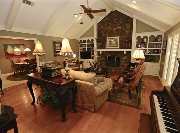 This 5 bedroom, 3 bathroom home is conveniently located across from the Reservoir in Audubon Point Subdivision. Both the dining room and breakfast area, which connect to the kitchen, give open views to the great room featuring a large stone fireplace, a beautiful vaulted ceiling, and built-ins. The hallway off the foyer leads to the master bedroom with vaulted ceilings and a unique walk-in tub and shower. Off that hall are also 2 bedrooms, a large keeping room with built-ins, the third bathroom, and a large laundry/utility room with additional counter space that could be used for entertaining. The hallway off the breakfast area connects the split-plan with sizable Jack and Jill bedrooms with trey ceilings. Two access points on either side of the kitchen lead outside to a very large, partially covered patio and private backyard. This home offers great value with floored attic storage, lots of closet space, a 2 car garage, a huge private parking pad and walk-to waterfront. Docks and trails are easily accessible throughout the neighborhood. Call today for your private tour.