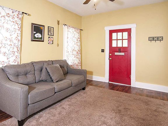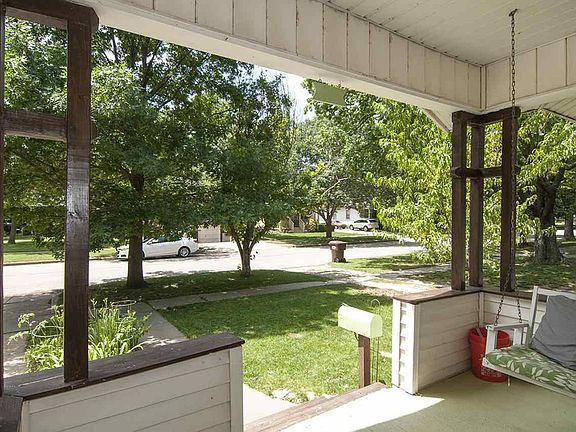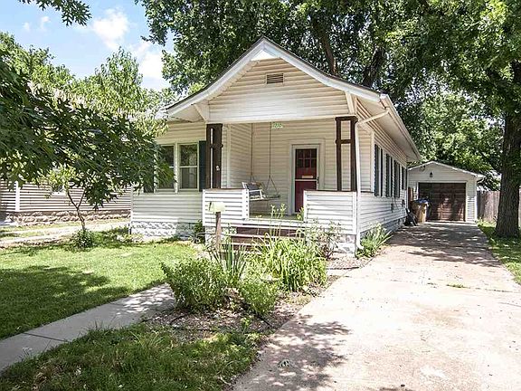 Riverside gem! Great charming starter home in the heart of the historic Riverside area of Wichita. Enjoy the traditional front porch swing, red front door, and classic shutters on the home! The home was built in 1900! The living room and dining area are open to one another, delightful space! There are two bedrooms with a full bath right in between! The shower is fully tiled! Both bedrooms have brand new carpet! The kitchen has granite counters and concrete counters! The appliances are stainless steal, which include an over/range and refrigerator. The backyard is fully fenced with a wood privacy fence and a detached one car garage that has an opener.