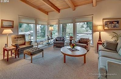 This is a Mid-century Premier Property in the gracious Glendoveer neighborhood. Beautiful wood vaulted ceilings, lots of natural light, soaring fireplace, tons of windows & a view like no other in this area. Spacious Master Suite + 4 other bedrooms. Kitchen opens to dining area w/ fireplace which has a slider to patio & landscaped yard w/hobby shed. One owner home beautifully maintained and your clients will not be disappointed.