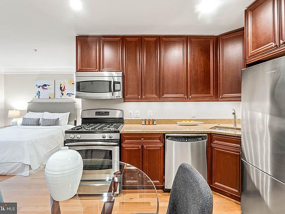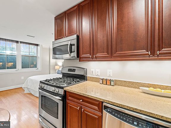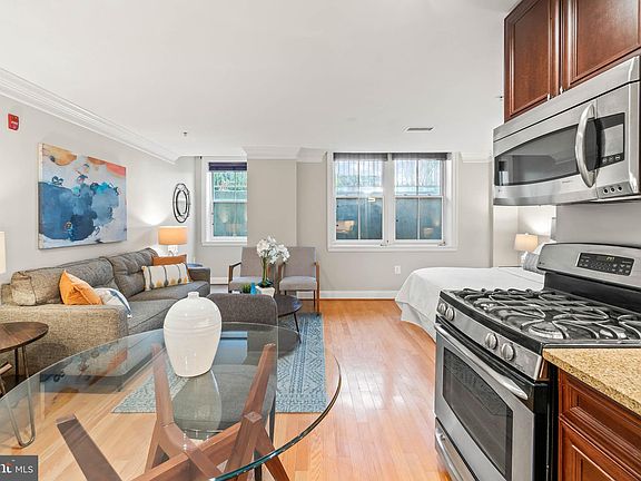 Live comfortably in this affordable studio at Logan Station: The entry-way leads to an eat-in kitchen with full size, stainless steel appliances including a gas range. Enjoy wood floors throughout, multiple closets, and the convenience of in-unit washer and dryer and central heating and air conditioning. This condo can accommodate a king size bed while still providing sufficient room for your living and dining setup. Additional space by the window bump out is perfect for a desk while you work from home. The large bathroom has a tub/shower combo with a frameless glass enclosure and built-in shelving for linens. Your new home at Logan Station is in a PRIME location, with a short walk to Logan Circle, the 14th Street Corridor, and downtown. Low condo fee ($294/month).