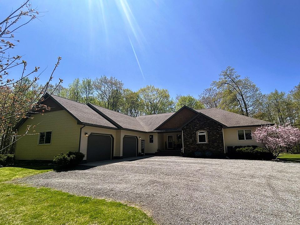 Stunning ranch style home with vaulted ceilings, attached garage and gorgeous features throughout. 3 beds on the main floor and a 4th in the lower level. 3 full bathrooms (2 on the main floor, 1 in the lower level) and a main floor laundry with 1/2 attached. Nat-gas heat, central AC, Allband fiber internet, hardwood floors, custom kitchen cabinets, Bosch appliances and solid wood doors make this well-cared for home even more awesome. The covered 23x17 corner porch off the kitchen is excellent for grilling and entertaining. The lower level has plenty of room for recreation including a bar area, plenty of seating, cozy woodstove and a walkout to the back yard. The ''syrup shack'' out back has everything to tap the trees and make syrup. 16.5 acres with trails, mineral rights included.