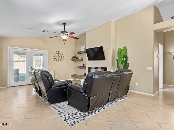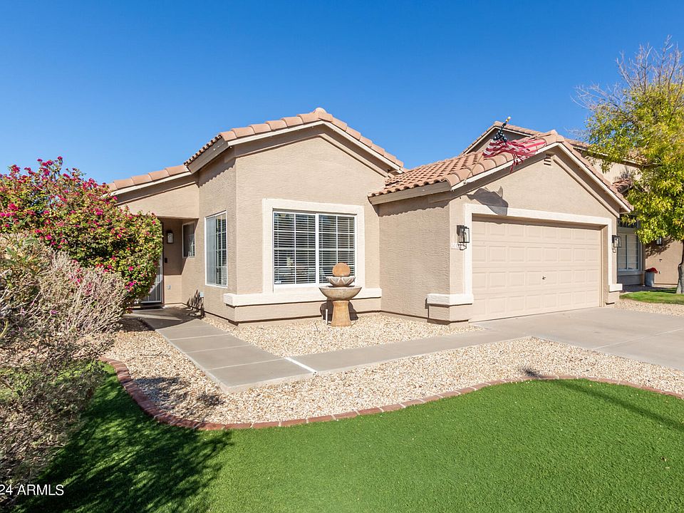Beautiful clean 3 bedroom 2 bathroom single level home in Blakeman Ranch in Chandler. Great curb appeal with an open concept floor plan and numerous upgrades. The spacious great room boasts vaulted ceilings, french doors, a contemporary fireplace, entertainment niche, diagonal neutral tile flooring and bountiful natural light. This opens to a fabulous eat-in-kitchen featuring custom alder cabinets and granite countertops with a breakfast bar. Retire to the primary retreat showcasing newer LVP flooring, private renovated bathroom with custom tile shower, matching alder vanity, upgraded lighting and walk-in closet. The private backyard invites you to unwind under the covered patio while enjoying your low maintenance yard with artificial turf, granite landscaping and a mature palm tree. New exterior paint in Oct '23, A/C in summer '20, heat pump in winter '22 & H2O heater in '23. Great location near downtown Chandler, Chandler Mall, and 101, 202, & I-10 freeways for quick access.