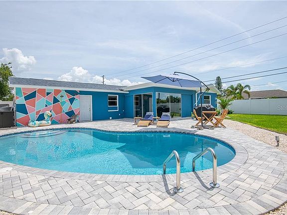 This home was purchased at auction, sight-unseen by the current owners. They invested over $140,000 plus six months of sweat equity to bring you the opportunity to call this tropical oasis your home. Their investment of time, work and money is yours to gain. You will not find a better appointed, more tastefully remodeled home for sale at this price in this zip code! This is your opportunity to buy that dream home at the beach on the beautiful Isle of Capri in Treasure Island, FL. As the parrot flies, it is just 1500 yds. to the warm Gulf of Mexico. Location, location and yes location! You are only a walk, bike, or golf cart ride away from great restaurants, night spots, eclectic shopping, AND the beach! John's Pass Village and its plethora of restaurants, shops, bars, and aquatic endeavors is just under 2 miles away. When you are done enjoying the beach, you come home to your own private slice of paradise on the Isle of Capri. The beautifully landscaped lot is 82' X 120' and valued at $283,751 by the Pinellas County Property Appraiser's office, who typically significantly under-value property. The concrete block home has all tile floors, remodeled bathrooms, interior and exterior paint, a brand new roof, fresh HVAC system, on demand hot water, a completely rebuilt pool with 10-year warranty, and all new paver pool deck. The kitchen features top grade appliances including European style Miele washer and dryer AND comes tastefully furnished in a clean modern style that affords both comfort and function. On Isle of Capri, only the corner lots at the end of the fingers/canals are non-waterfront and over-sized. This means you are surrounded by the upmarket persona of waterfront homes without the price tag. With very few competing properties, your value will stand strong. The backyard oasis was created with the addition of a paver pool deck and surround, a totally renovated pool including plumbing, a custom-painted art wall, fresh bright white limestone rock and tropical landscaping. Completely enclosed by fencing, most of which is attractive white vinyl, the backyard also benefits from mature landscaping that further screens the home providing for additional privacy. The huge back yard is great for so many things. You could practically host a half-field soccer game. Inside there are 3 spacious bedrooms, a remodeled kitchen and two awesome bathrooms. The master shower is nothing short of a spa-tastic experience with multiple shower heads and a hand-held spray! The 2-car garage will hold a car, your golf cart and all your beach toys. The kiwi green garage door with matching front door offset the deep river blue body of the house with meticulously painted brickwork and original Cuban-tile entryway. The exterior color scheme and landscaping look straight out of Palm Springs, CA. To be honest, this is a tasteful transformation of a typical ranch-style Florida home into a non-typical 2020 treasure! You need do nothing but bring your toothbrush and bathing suit - oh and stop by nearby Publix and grab everything you need for the BBQ and barrage of friends waiting to celebrate this great find with you! Imagine it all! Then, make it so! (Make sure to check out the 3-D Matterport Floor-Plan & Virtual Tour, as well as the Video Walk-through!)