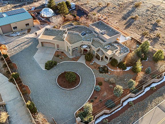 This gorgeous home in North Albuquerque Acres is a combination of elegant design and detail, gracefully arranged to provide superior comfort. This home is nestled in a beautifully landscaped and privately gated .89 acre lot. You will get to enjoy features like beautiful VIEWS from its covered balconies and large private patios. A cozy retreat area featuring a heated endless pool next to a beautiful kiva fireplace awaits you. This practical and versatile floorplan offers over 4,900 sqft of living area, which includes a detached guest house that is over 1,000 sqft. Detached building also houses a large RV garage and tons of storage space. There is an amazing large greenhouse where you can plant year round. All of this is powered by owned solar panels. Come and see for yourself!
