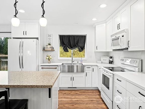 Choose the serenity of lakefront living in this 3-bed, 2.5 bath home. The open floor plan floods w/light. Fresh paint, hardwood look laminate floors. Beautifully remodeled kitchen, white cabinets, quarts counters, a charming apron sink & center island. The upper floor also contains the primary bed, complete with a remodeled attached full-bath, walk-in closet, stylish barn doors. The guest full bath is remodeled as well & there are 2 more bedrooms upstairs. Downstairs you'll find a huge bonus room (could be converted into a 4th bedroom & living area) plus an oversized laundry room with 1/2 bath. Other features include a 2-car garage, gas forced air heat, newer light fixtures, fresh exterior paint, all nestled in a gated riverfront community.
