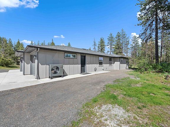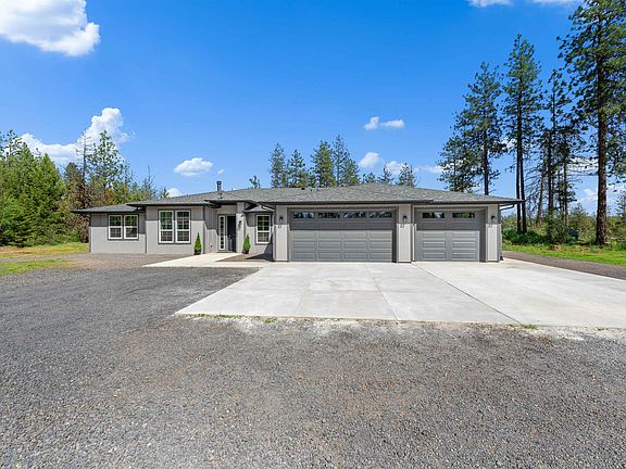 Beautiful custom home on 12.8 secluded acres with natural wildlife and seasonal creek in Nine Mile Falls! This contemporary 6 bed 4 bath home has the comfort of single level living, and the space to entertain guests with a large dining/family room and extended covered patio. Walk into the living room and your eyes will be drawn to the cozy wood burning fireplace with modern surround. The kitchen boasts beautiful quartz countertops and an eight-foot waterfall island. A butler kitchen, spacious pantry, and a room for formal dining or home office are conveniently placed nearby. Enjoy the inviting master suite with a lovely curbless walk-in shower, six-foot soaking tub, and walk-in closet. Bathrooms are styled with floating vanities and vessel sinks. Additional features include dual laundry connections, hot tub-ready patio, RV hookup, and radiant floor heat rough-in. Endless outdoor activities with nearby hiking/horse trails, recreation & state parks. Come tour this lovely home and make it your very own oasis!