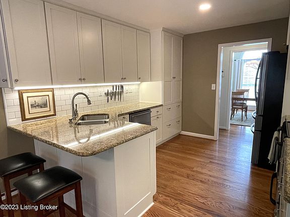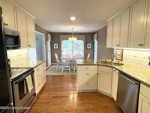 NEW LISTING! Fabulous opportunity to own an ALL BRICK RANCH home located in the desirable GOSHEN WOODS subdivision! North Oldham School district! Convenient to Prospect shopping. Located on a quaint cul-de-sac, this home has a welcoming front porch and bright foyer with adjacent VAULTED formal dining room with large window. Recently remodeled (2019) bright and cheery kitchen with an abundance of white maple tall cabinetry, GRANITE COUNTERTOPS, tiled backsplash, barstool seating, and breakfast dining area with access to the HUGE DECK overlooking the PRIVATE FLAT BACKYARD, with extended stamped concrete PATIO and custom treehouse playset. The stunning VAULTED FAMILY ROOM has a GAS FIREPLACE. Perfect setup for entertaining! The PRIMARY SUITE is sizable and has a walk in closet, dual sink vanity, jetted tub and separate shower. Two bedrooms and full bath are on other side of home and complete the main level. The lower level has a large family room with built in shelving, office or exercise room with closet, bedroom with egress window, and updated full bath. Substantial laundry and storage room too. Wonderful subdivision with easy access to Creasey Mahan nature preserve (170 acres) with hiking trails, playground and library. Convenient to US 42 and downtown, expressways and shopping. Throughout this home, you will find new fixtures, smooth ceilings, hardwood flooring, numerous closets and recently painted neutral colors! The home has been well maintained with 2018 HVAC, smart wifi thermostat, smart electric meter, the list goes on and on. This house just feels good! Nothing to do, but move right in. 3 car garage is loaded with storage and a DIY or mechanic's dream. IMMACULATE home. QUICK POSSESSION possible. Call today!