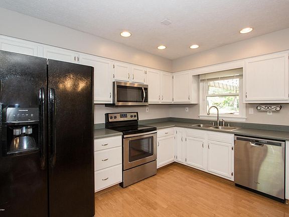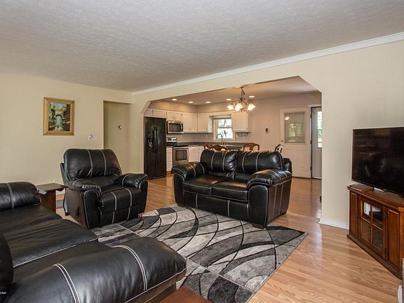 Perfect Goshen 3bd/2ba ranch home on a large lot with two car attached garage in North Oldham school district! Functional floor plan with a large living room and updated, open kitchen with eat-in space overlooking the enormous back yard. First floor master suite with dual closets and master bathroom. Easy-maintenance flooring and two additional bedrooms with updated full bath. Basement features large family room, additional office space with tons of closet space, and wet bar. Large laundry room with built in storage and unbelievable work bench/storage space + attached two car garage. Roof is less than a year old! Harmony Elementary, NOMS, and NOHS!