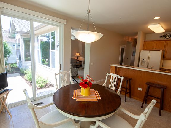 Outstanding Pristine Move in Condition Corner Brick and Aluminum Ranch on a bright sunlit landscaped lot! The lush green yard has a mature oak and and pear tree! There is a Beautiful Bay Window in the Living Room overlooking the yard. As you walk up to this special home you will feel the Curb Appeal and Excellent well maintained Exterior Condition with its newer Architectural roof, covered fascia and covered overhang above the front entry. The owner has been a "Snowbird" for 20 years and has kept this home in "like new" immediate move in condition! This home does have an open and inviting floorplan but also runs efficiently without any soaring ceilings. The doors, walls , floors, fine framed windows, baseboards all look to be in superior condition. The Front bedroom with oak floors has its own full bath and tub. The private MASTER bedroom is overlooking the yard in the back of the home and has a large picture window, oak floors and connected Master Bath with a shower. The Kitchen has gleaming tile floors and a large eating area and a glass sliding door leading to the large concrete patio ( 16'X13') and privatized yard area. There are ceiling fans as well. The first floor laundry room has cabinets above the full size washer and dryer and a newer hot water tank! The EXTENDED and Drywalled 2 Car Attached Garage has an easy Pull down stairway and a XL drywalled and floored ATTIC and it even has a window with a lot of Extra Storage!! And this home is HERE at Del Webb Sun City Midwest with so much to offer including but not limited to : Golf, Fishing, Indoor and Outdoor pools, Clubhouse, Bocce, Softball , Tennis, Pickle Ball courts, Billiards and more to join if desired, along with a Ballroom/dance, so many social and cultural clubs to consider joining and even bridge and canasta card clubs.. too much to mention+++! Don't miss this special home. It is a for sure 10 out of 10!
