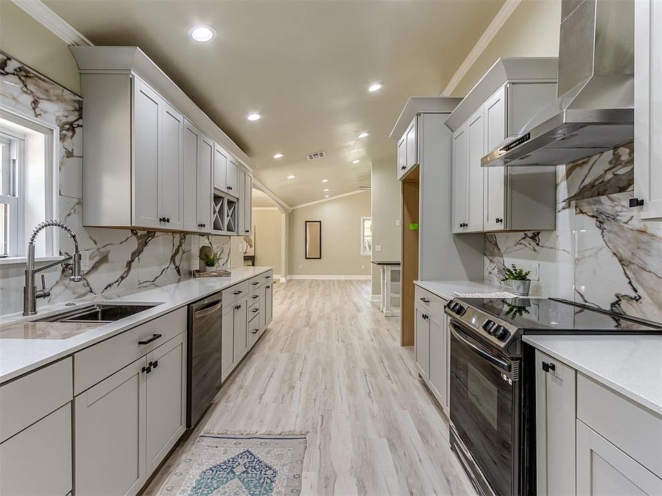 Welcome to your dream home—a beautifully remodeled, expansive 4-bed, 3-bath. This beautiful home blends modern luxury with ultimate comfort on a sprawling half acre lot within the desirable Choctaw Nicoma School District. This thoughtfully upgraded property offers the best of both worlds: elegant interior design and functional outdoor space. Step inside to discover a spacious living room filled with natural light, featuring a decorative fireplace. The versatile dining area boasts a breakfast island with a foldable extension, ideal for casual meals or entertaining. The large kitchen, equipped with custom-ordered cabinets, sleek countertops, a stylish stainless steel vent hood and a brand-new stove and dishwasher, is a chef’s dream come true. The master suite is a sanctuary of comfort, complete with a spacious bedroom, a luxurious master bathroom showcasing elegant tile work, a walk-in shower, a lighted mirror, and a beautifully crafted vanity. An adjacent custom built walk-in closet provides an abundance of storage with a large island, drawers, hangers, and shelving. Three additional generously-sized bedrooms also feature walk-in closets and share a well-appointed guest bathroom. A large family room, complete with double patio doors. The adjoining bathroom includes an immaculate tiled glass shower, adding a touch of modern luxury. This home includes a spacious laundry room with a large sink and ample cabinetry for added convenience. Recent upgrades include new breaker boxes, wiring, plugs, fans, and lighting throughout the house; two new HVAC systems; new roof with Class 4 architectural shingles; new windows and screens; and all-new doors. Plumbing has been updated with PEX lines, drywall replaced or reworked for uniform texture, and a new water heater installed. The well pump and septic system have been updated. Outside, you’ll find a charming front porch, a garden shed. Seller will provide a one-year home warranty for peace of mind.