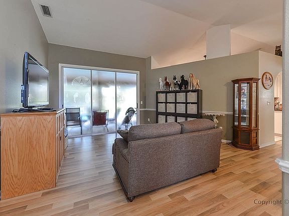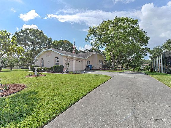 Active Under Contract. Located on a quiet street and nestled on a half-acre of land. Close to the Suncoast for easily traveling for work or leisure. The mature landscaping in the front and side entry garage really add to the curb appeal. This layout just keeps going. Over 2,000 square feet inside gives room for all. The formal living and dining room areas greet you walking though the double front doors. Laminate flooring flows through all the living, dining, family and guest bedroom areas. The kitchen holds tile floors, plenty of cabinet and counterspace along with recessed lighting above and a breakfast bar. The solid surface countertops compliment the black appliances. The breakfast nook area has views of the pool and is a great spot for a quick bite or to sip your coffee. All of this overlooks the bonus family room area with a cozy fireplace and windows surrounding. Soaring ceilings all through the home really open up the space. Both guest bedrooms are a comfortable size with great closet space. The guest bath has a large vanity area and recessed lighting above. The split floorplan gives the master privacy. The master bedroom is well equipped to handle large furniture if needed, two closets, one being a walk-in, and has access to the lanai. Master bath holds two sinks, a jetted tub, and large walk-in shower. The lanai has enough space to relax out of the sun with a ceiling fan above. Large steps on either side of the pool make entry easy. The back yard has winding oak trees creating a park like scene in your own backyard. Come and view this lovely home today!
