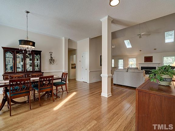 One of the rarer homes in Harrington Grove. This split BR, crawl space ranch is located at the entry of a cul-de-sac. Walk into soaring ceilings w/skylights ushering in abundant natural light. Open floorplan. Additional room for great office space/bonus. All masonite siding replaced w/ColorPlus Hardiplank, new gutters/downspouts('19). Roof replaced('14). Garage door and LiftMaster opener w/wireless key entry('17). Vented gas logs('19). Nicely landscaped and close to all the daily conveniences/Brier Creek.