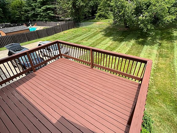 Large deckCovered patioLarge eat-in kitchenFully finished walkout basementLarge drivewayLarge utility roomPartially fenced in backyard
