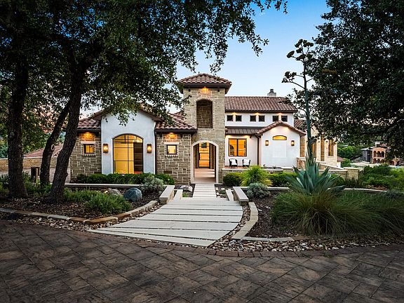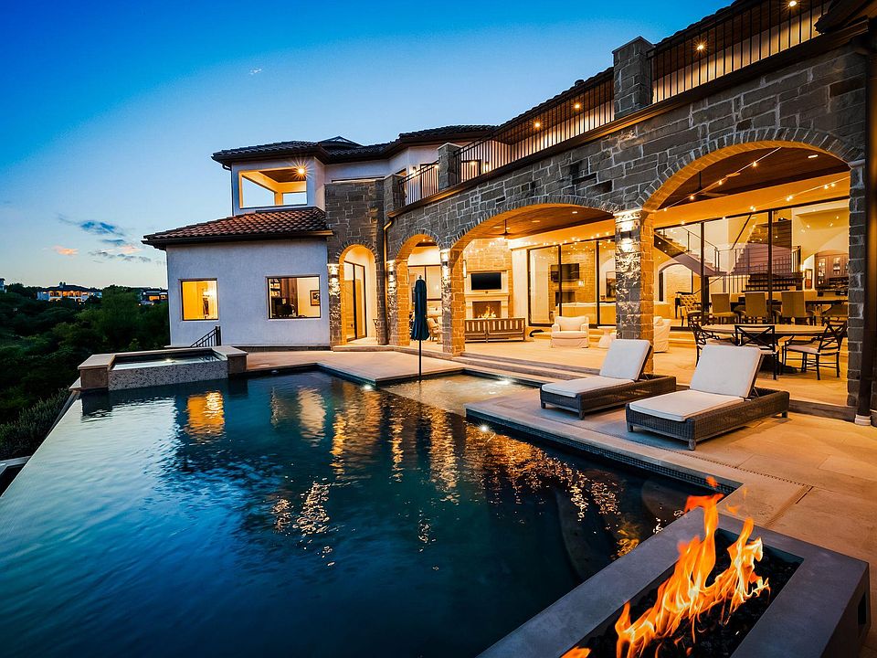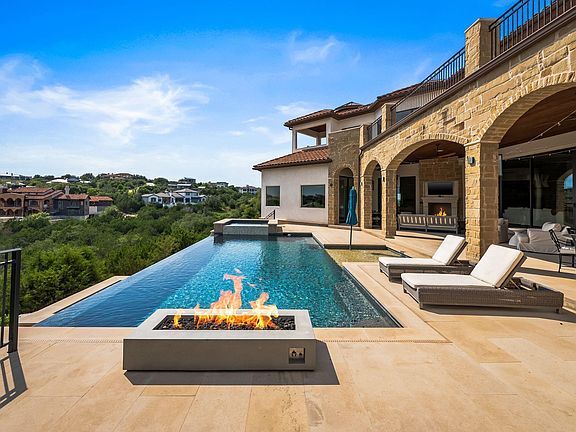 Discover the ultimate in luxury at this stunning Modern Spanish estate by Built Green Custom Homes, tucked into Spanish Oaks - the most exclusive, guard-gated community in Austin. Perched on a scenic ridge this 6,556 sq ft masterpiece sprawls across 2.2 private acres offering unobstructed Hill Country views. Set down a long driveway the property offers incredible privacy and a spectacular approach. Inside the home you are greeted by soaring 20-foot ceilings and walls of Fleetwood glass doors that flood the space with natural light. The home features 5 bedrooms, 6 bathrooms, and premium finishes throughout. The chef’s kitchen dazzles with top-tier Thermador appliances, a massive Calacatta Marble island, and a beautiful butler’s pantry for entertaining. The kitchen flows seamlessly into an open concept living room with fireplace, dining, and full bar—all framed by panoramic views. The primary suite is your personal sanctuary with fireplace, sliding glass doors to the pool, spa-inspired bath with soaking tub, frameless shower showcasing hill country scenery, and an enormous walk-in closet. Ascend the circular staircase to a private overlook—ideal for sunrise coffee or sunset cocktails. Enjoy time with friends and family in the state-of-the-art media room or game room with shuffleboard and multi-screen set-up to watch all of the games at once. The outdoor oasis steals the show: infinity-edge pool and spa, outdoor kitchen, fire pit, multiple lounging zones, TV, fireplace, and a sprawling deck with pool table, all against rolling hills and fiery Texas sunsets. Additional luxuries include an attached casita (bedroom, bath, kitchenette, balcony), 3 additional guest bedrooms, family room with gym, view-filled offices, piano room, pool bath, 3 car garage plus parking for 6-8 more cars and well water for irrigation. All of this just 20 minutes from downtown in Austin’s premier golf community with 24/7 guard gated security, championship golf, hiking trails and much more.