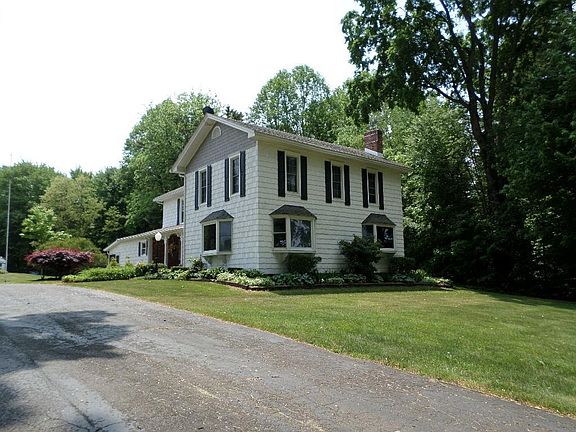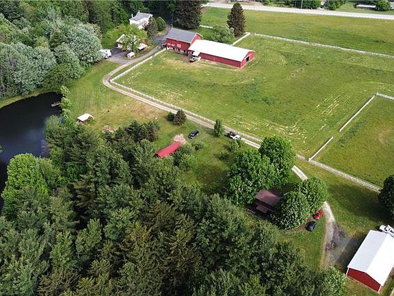 This property is 1 of a kind. Beautiful horse farm on 20 acres, 2 houses. Main house is beautifully remodeled with wood flooring. Bank barn w/ 7 stalls, self waters, saw dust room and birthing stall. 60x120 indoor riding arena w/ 4 stalls and room for more. Heated tack room w/ bathroom. Gas well is owned. 2 huge pole bldgs; 30x70 and a 40x60 w/ compressor & lift. Log cabin has rental potential - sleeps 10 w/2 bdr & 2 baths. Apple and pear orchard. 2 driveway entrances. 16' deep stocked pond.