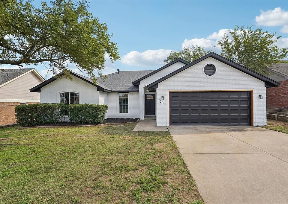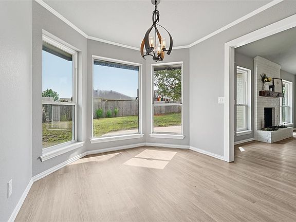 Step into this thoughtfully updated 3-bedroom, 2-bathroom, 2 car garage home offering 1,443 square feet of stylish living space in a quiet Shawnee neighborhood. With fresh improvements throughout, this property blends modern design with everyday functionality. The open-concept layout features high ceilings, light wood flooring, and abundant natural light. A white brick fireplace anchors the living room, which flows into a spacious bright breakfast nook framed by bay windows. The kitchen showcases white cabinetry, marbled backsplash, stainless steel appliances, and a sleek black faucet—all part of the recent updates. Both bathrooms have been updated with sleek black fixtures, white vanities, and marble-style tilework, creating a clean and contemporary feel. Enjoy peace of mind with a new roof installed in 2025, central electric cooling, and gas heating. Located in the Grove School District with easy access to local amenities.
