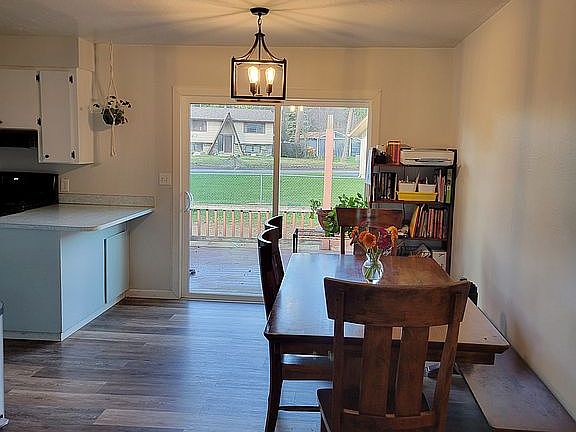 Beautiful home tucked into a nice quiet neighborhood only 5 minutes from beautiful lake Coeur d' Alene and multiple hiking trails. This home has 3 bedrooms and 2 bathrooms upstairs with gas fireplace to enjoy those beautiful north Idaho winters. Sliding door off dining room opens to deck to overlook large fenced back yard with mature fruit trees 2 pear and 1 apple that always produces amazing yields every year. Basement has family room with pellet stove and small kitchenette with separate washer and dryer hookups, 1 bathroom with 2 non conforming rooms, has separate entrance with small patio area and separate driveway. Basement is great for guests or to rent out. Upstairs has been newly remodeled, fresh paint, waterproof LVP flooring, new windows installed in February.