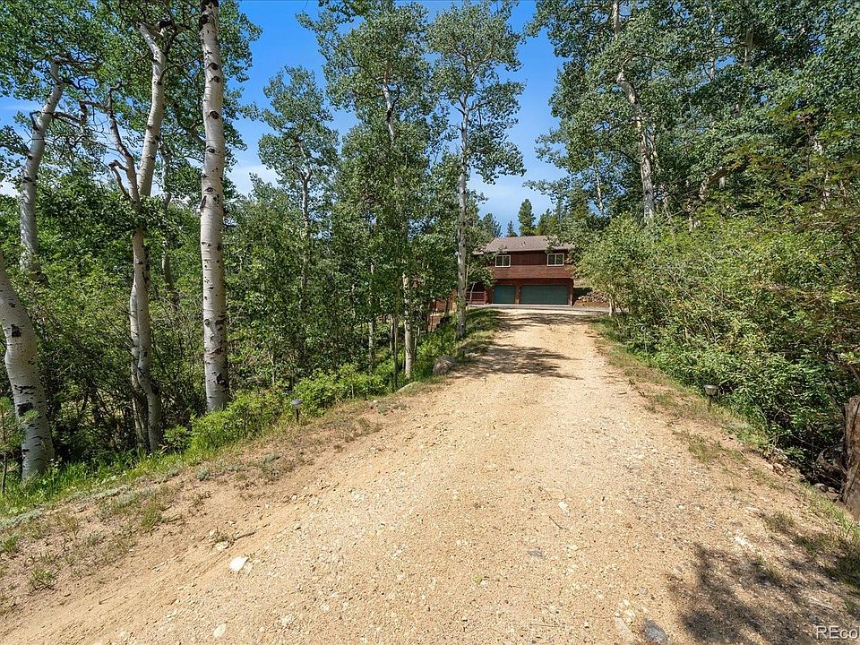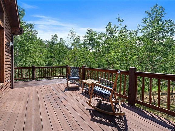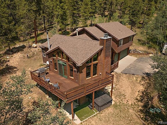 Welcome to your dream retreat in the heart of nature! This mountain home is complete with a peaceful acre lot with its own seasonal stream flowing through the front of the property. The home has been well maintained with freshly stained exterior and the roof is only two years old. The main level welcomes you with abundant natural light, an inviting open floorplan, vaulted ceilings, and exposed beams, seamlessly integrating the kitchen and dining areas with the rest of the space, ideal for hosting gatherings. Enjoy crisp Colorado winter days beside the wood burning stove or bask in the sunshine on the expansive wood deck, soaking in the panoramic mountain scenery and observing the abundant wildlife that call this area home. This charming home features three bedrooms, four bathrooms, and a loft on the upper level, while the lower-level walkout basement provides an additional flexible living area with high ceilings. The attached three-car garage is oversized with a ton of built in storage. The Missouri Lakes Community enhances your mountain lifestyle with its own fishing ponds, county-maintained roads, and a local community recreation center. Roof was replaced in 2022!