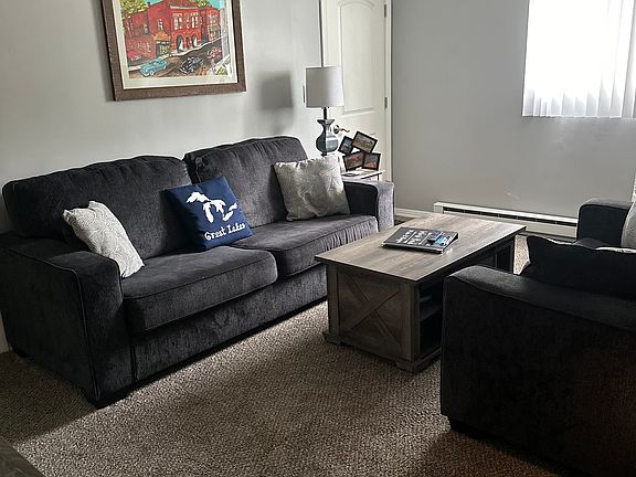 This two bedroom apartment comes fully furnished. *Kitchen includes appliances : stove; microwave; washer; dryer ;new refrigerator; Keurig coffee maker ; table & chairs; plates; glassware ; flatware; pots and pans. *Bedrooms include: double beds; linens ; comforters ; dressers ; night stands & lamps. *Living room includes: sofa & loveseat ; coffee table ; end tables ; lamps and entertainment stand with wi/fi TV . *Newly remodeled bathroom includes surround ; sink & vanity ; Blue tooth equipped vent with light. Short walk to the scenic Ashtabula Harbor and overlooking the river. Small front porch with 2 chairs. This is perfect property for a young professional starting a residency, college graduate starting a career or retiree. Lawn care and snow plowing provided, just bring your clothes. Tenant pays all utilities: Electric; water and sewer. No smoking unit.
