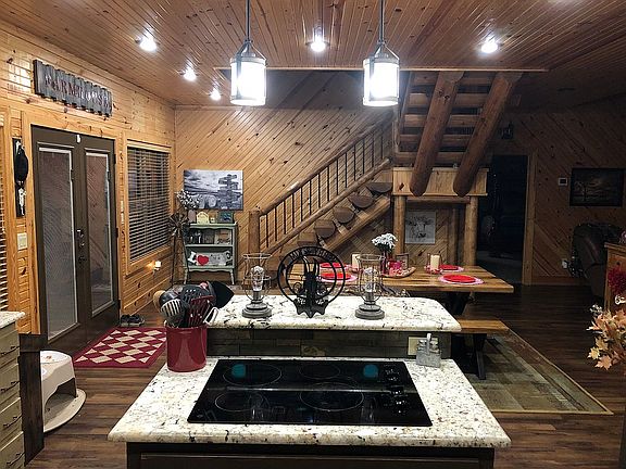 This 3200 sq. ft. ranch style log cabin home is located off of Highway 82 E inside the city limits. There is an asphalt driveway, a wrought iron fence located along the front of the property, and an automatic gate. Adjacent to the house sits a 4700 sq. ft. insulated shop (2200 ft. enclosed) with a floored upstairs and a half bath. Both the house and the shop are connected to a backup generator in case of power outages. The house itself has a wrap around porch with a beautiful view of the fully stocked 5 acre pond and the neighboring homes. The inside of the home features four bedrooms and four full bathrooms, a gas fireplace, vaulted ceilings, and a wooden log staircase. All four bedrooms are accompanied by walk in closets. The master bathroom has a 4 ft. x 5 ft. walk in shower and his and hers bathroom vanities.
