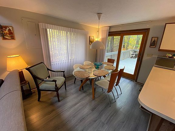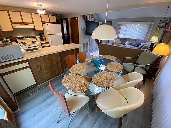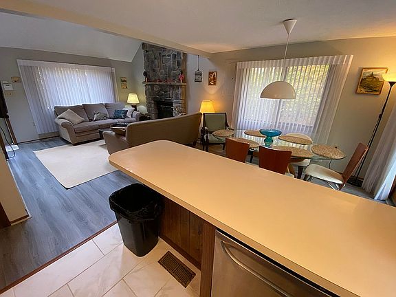 Contemporary Salt Box in the gated, amenity-filled community of Arrowhead Lake. This 3 bedroom, 2 bath home has a floor to ceiling wood burning stone fireplace in the living room, cathedral ceilings and 2 skylights. The dining area has sliders to the back deck with a hot tub. Kitchen has tiled floors and an eating bar. A pantry closet adds more storage space. This floor also has a bedroom, full bath, and a closet with a stackable washer/dryer. Upstairs has a loft, an updated bathroom with tile floors, and 2 bedrooms. Propane heat that AC could be hooked into. Home is on 0.38 acres an has a shed for storage.