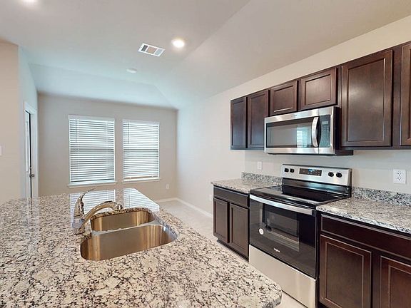 The Ashburn plan is a one-story home featuring 3 bedrooms, 2 baths, and 2 car-garage. The entry opens to the guest bedrooms and bath with hall linen closet. The kitchen includes a breakfast bar with beautiful granite counter tops, stainless steel appliances, corner pantry and opens to family room. Bedroom 1 offers privacy along with attractive bathroom features such as 36" x 60" shower with ceramic tile, water closet and walk-in closet. The standard rear covered patio is located off the dining area. You’ll enjoy added security in your new DR Horton home with our Home is Connected features. Using one central hub that talks to all the devices in your home, you can control the lights, thermostat and locks, all from your cellular device. DR Horton also includes an Amazon Echo Dot to make voice activation a reality in your new Smart Home on select homes. With D.R. Horton's simple buying process and ten-year limited warranty, there's no reason to wait. (Prices, plans, dimensions, specifications, features, incentives, and availability are subject to change without notice obligation)