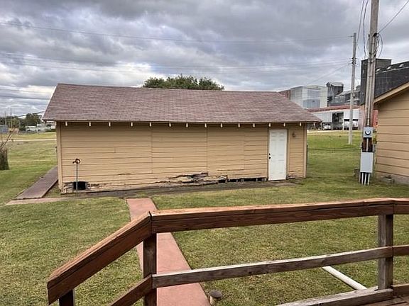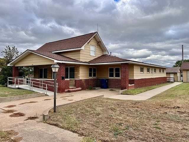 Great space in this 2500 plus sq ft home. On just over 2 acres in town. House is 5 bdrms depending on how you use the rooms or several living spaces. 2 baths. Large kitchen with huge island bar, eating area, pantry and stone fireplace. 3 bedrooms downstairs 2 bedrooms are large dorm style rooms. Large handicapped bath. Handicapped entry on front and bath. Upstairs has 2 bedrooms. Walk-in cedar closet downstairs. 2 car detached shop with bath and office area. Also has another separate garage with siding damage and a block building that has seen better days. This home was a group home in the past and has a lot of space. House is not perfect and some of the floors are un level due to additions being added to the house. Some door ways and trim work needs to be repaired. Seller is selling "AS IS" . There are some shingles missing on part of the house, we are in the process of getting bids. To the north of the house are some monitoring wells flush with the ground see photos. Seller has limited knowledge of the property and does not know anything about why the tub says don't use in one bathroom or anything about the monitoring wells. Utilitites are on. Probably won't qualify for USDA, FHA or VA loans.No real estate taxes being assed at this time since this is owned by not for profit. Total county assed value is about $85,000.00. You can call the county to get an estimate of real estate taxes. See photos for additional information
