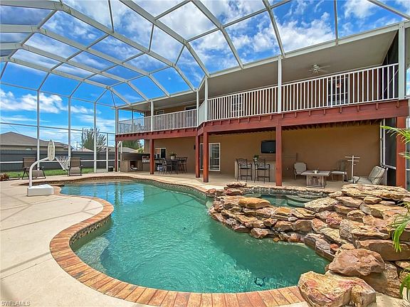 REDUCED! Gorgeous, SW Cape Coral, 2 Story Home! An oasis - live like others vacation! Granite Kitchen Counters, tile backsplash, wood cabinets, wood plank tile new in 2020! Stainless appliances! Privacy Fenced back yard installed in 2019. Newer Lighting, fans, entry doors and windows! New roof in 2017, A/C and Hot Water Heater in 2015! Home features: 3 bedrooms upstairs, including primary bedroom with full bathroom & walk-in closet, well-equipped kitchen, guest bathroom, living and dining rooms on upper floor with attached deck across entire back of the home overlooking the gorgeous pool/private backyard! First level is a dedicated entertainment area with 1/2 bath, 2 LARGE BONUS ROOMS (offices/dens, etc) and laundry room. Sliders lead out to the Pool and spa with pebble tech bottom, waterfall and sun deck - features large stone boulders around spa NEW pump in 2019. TWO-STORY screen cage! Complete home Repipe with UPONOR piping - longest 25 year warranty - in June 2020! Outdoor bar, kitchen with grill, sink and a fire pit. Landscaped Front Yard/Re sodded back yard May 2020 with BeeHyve app to control irrigation/sprinkler system. An entertainer's dream home, in the perfect location.