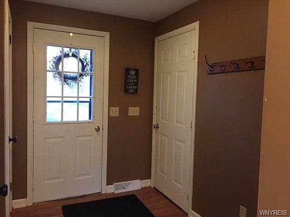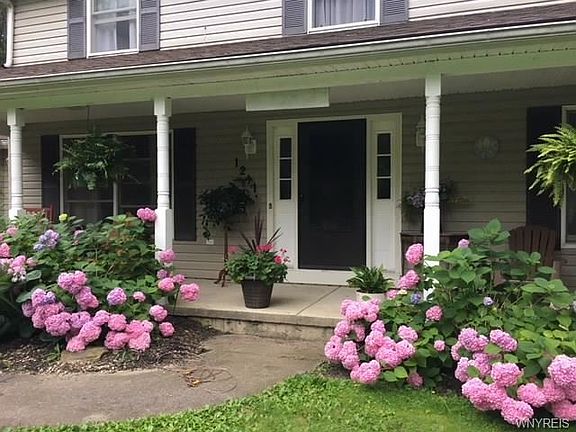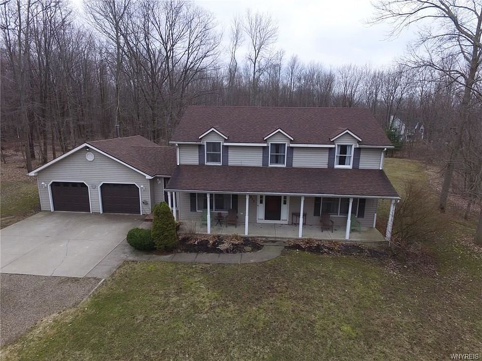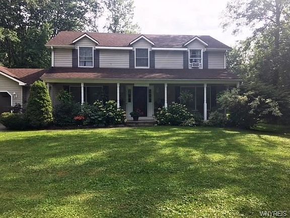 Open house cancelled. House is under contract. No further showings. Your own private oasis awaits. Lovingly cared for and updated colonial with covered front and rear porches and deck on nearly 4 acres of wooded peace. Family room with cathedral ceilings, wood burning fireplace off updated kitchen both leading to deck. Roomy living room with French door and access to full bath with step-in shower. Covered country porch leads to large foyer. Second floor master bedroom with full bath with ceramic floors in 2014, double closets. Extra large 2.5 car garage offers plenty of room for workshop. Sliding glass doors lead to covered patio. Deep basement with 8 foot ceilings has endless possibilities. Sump pump with water back up system, Trane furnace 2015, HWT 2016. This a fabulous place to call home! Evans-Brant Schools.