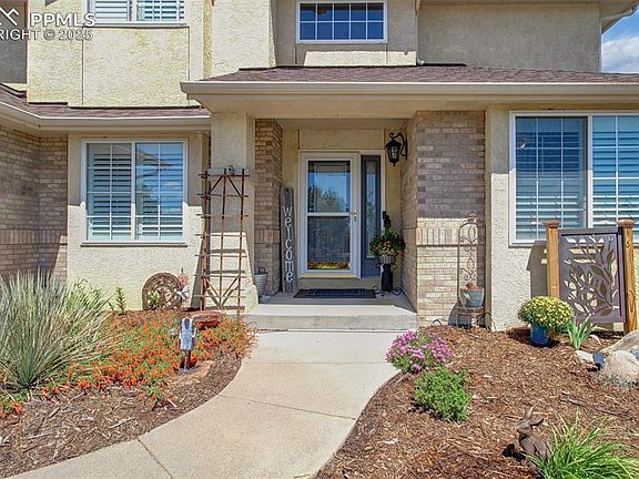 If you’ve been looking for a sanctuary near the Springs to call your own, this is your Falcon oasis. Sitting on just over a ½ acre it has been impeccably landscaped. Upon pulling up to the home you notice the beautiful walking path among trees and shrubs giving a woodland park feel. You are welcomed in at the covered front porch. Upon entering the home, you enjoy the vaulted ceiling and inviting space. The main level office is off to your right behind French doors. The living room opens to the dining area and kitchen. The kitchen is cozy and has stainless steel appliances that will all stay. The seller currently has an electric stove, but it is plumbed for gas as well. Walkout to the patio space, abundant with flowers, a pergola and a privacy fence. A peaceful space to enjoy or entertain. There is a formal dining room off the kitchen. The main level includes a ½ bathroom and the laundry space off the garage. The garage=WOW! The main 2-car stall is deep enough to park a full-sized pick-up truck with room to walk around even with the built-in storage and shelving. There is a service door to access the backyard. The third stall is currently used as a workshop with abundant space and more storage. The upstairs of the home has two nicely appointed secondary bedrooms and a full bathroom. Down the hallway is the primary suite with an ensuite 5-piece bathroom, huge shower, dual sinks and large walk-in closet. There is a built-in bar, large entertainment space, a crafting table with built-in shelving, another full bathroom and a fourth bedroom with a walk-in closet in the basement. The property is fully landscaped, with a perennial garden with a sprinkler system, 2 vegetable gardens, a walking path, a large fire pit, and a dog pen. A second flagstone patio to enjoy, a wooden walkway, outdoor gated storage space, a storage shed that stays and RV parking. The roof was replaced in 2021. This house is amazing, come check it out for yourself.