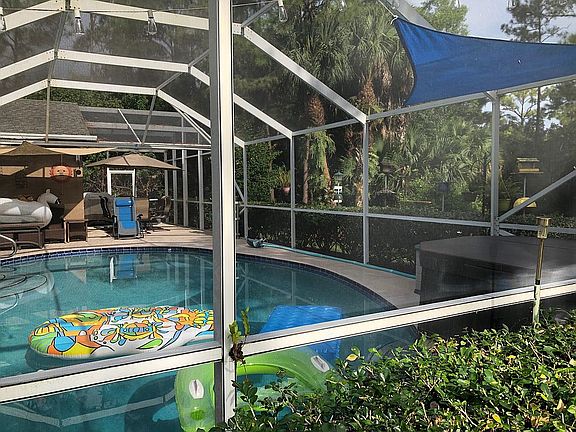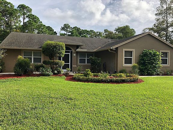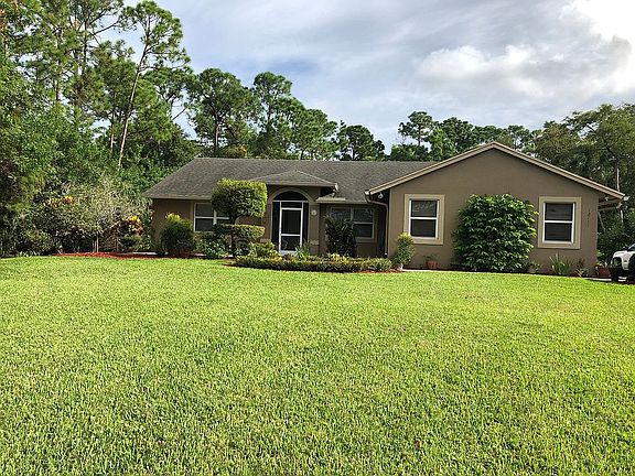 Immaculate CBS home in Jupiter Farms! Home features 5bd 2ba 2 car garage on over an acre w/pool. This split bedroom flr plan offers sep. dining room, large great room w/fireplace open to kit w/breakfast bar, large utility room and all bedroom w/exception of bd 5 have walk in closets. Enjoy outside screened pool w/jacuzzi tub & outside hot/cold shower. This home is very well maint. w/new roof & gutter 4/21, well pump 2020, septic last pumped 2020, new pool pump 2020, A/C 2010 service every 6 mths. See list attached to MLS