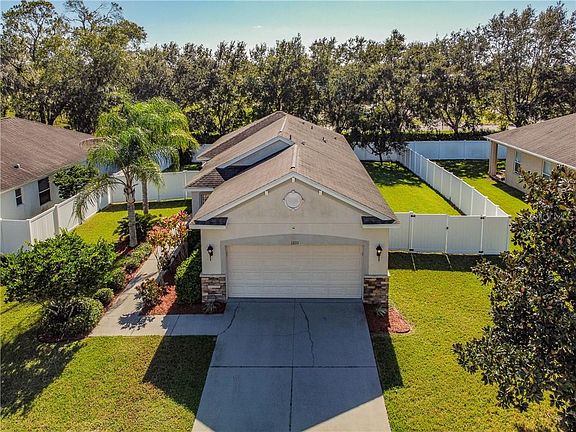 LOOK NO MORE, this lovely 3BR/2BA home in desirable LAKESIDE PRESERVE is move-in ready and available for IMMEDIATE OCCUPANCY. As you walk towards the entry you notice the LEDGER STONE exterior. The OPEN FLOOR PLAN is great for entertaining with the kitchen accessible to the Living/Dining area. The kitchen features tall 42" WOOD cabinets, GRANITE countertops, and an eat-in area with a coffee bar. There are 10' CEILINGS throughout the house with 5" BASEBOARDS and tile flooring in living, dining, and kitchen. A SPLIT BEDROOM plan provides a private setting in the owner's suite with a large closet and en-suite bath with double sinks and granite counters. The remaining two bedrooms and bath are very spacious. From the covered patio enjoy the 6' VINYL PRIVACY FENCE encompassing the entire backyard with a FIREPIT and double gates large enough to park a BOAT. The OVERSIZED GARAGE with side door entry, water supplied irrigation system and hurricane shutters are additional features. The established community with low HOA and NO CDD fees has a playground, basketball court, and is CONVENIENTLY LOCATED to restaurants, shopping, and schools. Minutes to the Fort Hamer Park with boat and kayak ramps and the Florida Railroad Museum. Easy commute to beaches, St Pete/Tampa, and TIA airport.